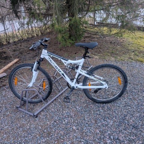Hyväkuntoinen laatumaastopyörä junnulle, n. 8-11 vuotiaalle. Laatumerkki, vaihteita 21, etujousitus, levyjarrut. Uusittu tänään vaihdevivut, jarruvivut ja rikkinäiset vaijerit. Kulumaakin on, esim. polkimissa ja rungossakin jotain naarmuja, lokasuojat mukaan.