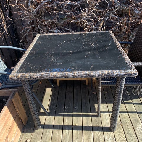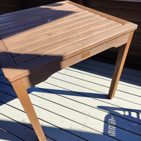 Puinen ruskea pöytä ja siihen kuuluva puinen penkki. Massiivipuuta. Puuöljyllä öljytty viime vuonna. Pöydän toisesta päästä puuttuu kuvassa näkyvä "tappi". Pöytä 103cm pitkä, 77,5cm syvä ja 74cm korkea. Penkki 98,5cm