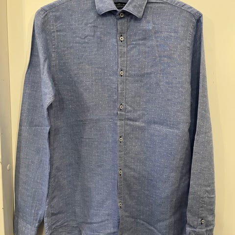 MIESTEN KAULUSPAITA,UUSI koko M. Materiaalina60% puuvilla,40% viskoosia.kuviointi muodostuu pienistä toistuvista kuvioista tummalla pohjalla. Pitkät hihat ja nappikiinnitys edessä. Soveltuu kaikenlaisiin juhliin esim. pikkutakin alle , tai rennompaan juhlimiseen esim. T-paidan, farkkujen kans .