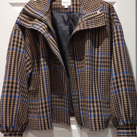H&M naisten takki, koko M. Puuvillainen, kevyesti topattu takki, jossa kirjava mustavalkoinen kuosikangas ja mustat reunukset. Edessä painonappikiinnitys ja kaksi etutaskua. Sopii käytettäväksi esimerkiksi sisä- tai välikausitakkina.