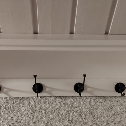 Vanhan vihreä sävyinen puinen emännän hylly kolmella koukulla. Hyllyn leveys 40 cm, korkeus 20 cm ja syvyys 16 cm. Kiinnitetään yläosasta ruuveilla joille reiät jo valmiina. Hyllyyn tulee mukaan kaksi etuessua jotka näet kuvissa.