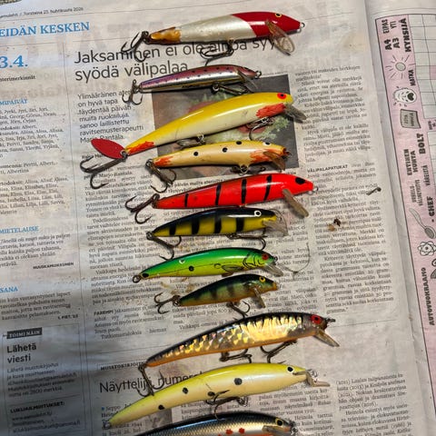 Kuvassa näkyvät, lisäksi muovipussissa näkyi olevan pieniä palikoita, mitä muutama pahvilootassakin.. kevyitä, eli balsaa kait. Samfishingilta Kuopiosta kaikki aikanaan tilattu. Isä piti aikanaan vaapuntekokursseja, sieltä jääneet. Varaston siivouksessa tuli eteen. Uintilevyjä oli useita kokoja ja mitä pusseja kattelin niin kymmenkunta ainakin kaikissa jäljellä.