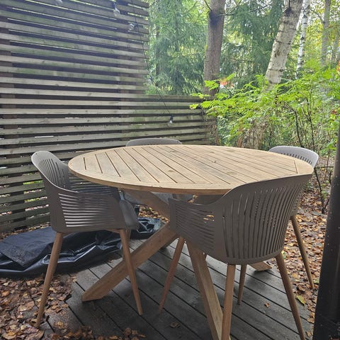 Terassiryhmä jossa siro teräsrunko, ilmava textilene-kangas ja pöydässä lasikansi. Hieman kulumaa lasissa. Muuten kunto on todella hyvä.