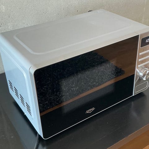 UPO mikroaaltouuni teräskuorilla. Etupaneelissa on digitaalinen näyttö, painikkeet ja kaksi säätönuppia tehon ja ajan valintaan. Laitteessa on sivulle avautuva ovi ja lasinen luukku, josta kypsennystä voi seurata. Soveltuu ruoan lämmittämiseen ja sulattamiseen kotikäytössä.
