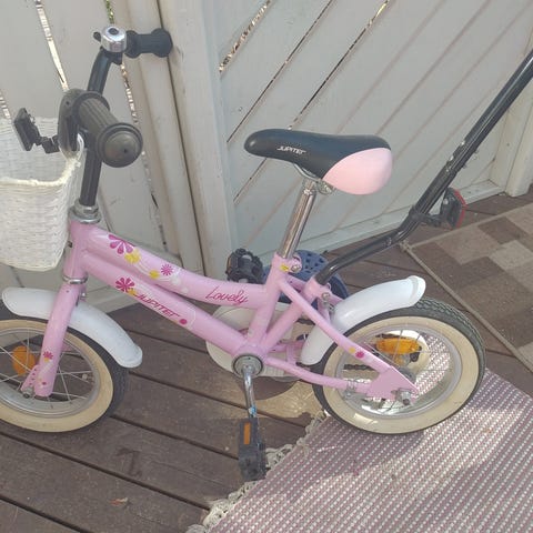 Käytetty ja hyvässä kunnossa oleva DBS lasten 12" pyörä tankoineen. Hyvät jalkajarrut. Apupyörät sisältyvät hintaan. 25 euroa.