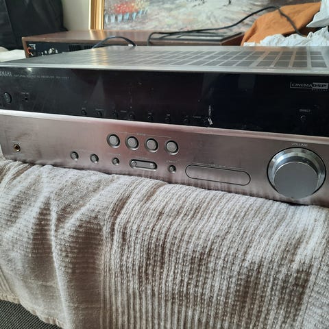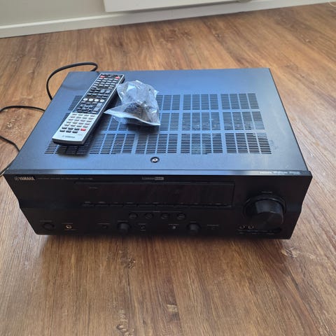 Vahvistin: JVC RX-6010R (5x100W). Monipuoliset liitännät ja kova teho. Mukaan saa kaukosäätimen (jos löytyy).