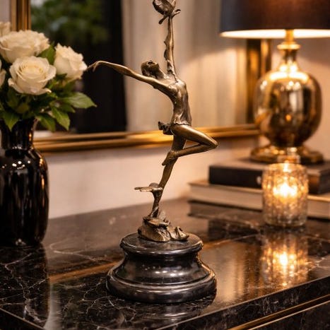 Elegantti pronssin-tyyppinen veistos, jossa on suloinen tanssija linnun kanssa, kauniin yksityiskohtainen ja täynnä liikettä. Asetettuna kiinteälle marmorialustalle se lisää hienostunutta ja taiteellista kosketusta mihin tahansa sisustukseen. Ajaton koriste-esine, joka sopii täydellisesti klassiseen tai ylelliseen ympäristöön.31,5 cm korkeaTämä Xclusive -tuote lähetetään erittäin hyvin pakattuna. Lisäksi pakkaukseen kiinnitetään hauras-teippiä, ja lähetyksen jälkeen on saatavilla seurantanumero paketin seuraamiseen.