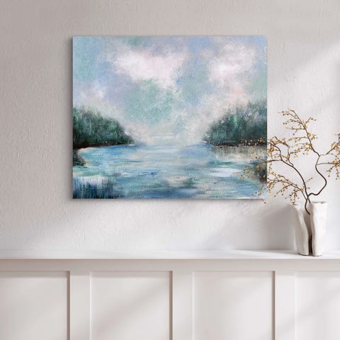 Maalaus, jossa on sinisävyinen maisema. Värit ovat pääosin sinisen, valkoisen ja harmaan sävyjä. Sopii seinälle sisustuselementiksi esimerkiksi olohuoneeseen, makuuhuoneeseen tai työtilaan.