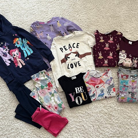 Tyttöjen vaatepaketti, koko 122-144 Paketissa on useita erivärisiä ja -kuvioisia vaatteita, muun muassa t-paitoja, tunikoita ja legginssejä. Vaatteet ovat kirjavia, joukossa on esimerkiksi keltaisia, vaaleanpunaisia ja kuviollisia malleja. Sopii tytölle arki- ja vapaa-ajan käyttöön.