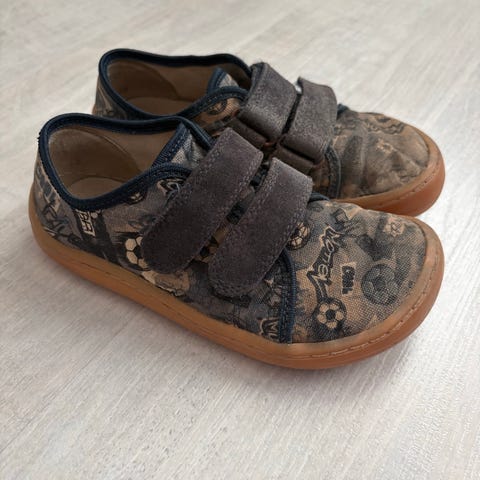Vuosi sitten uutena ostetut ja yhden lapsen käyttämät Froddon Barefoot Canvas pj-kengät koossa 27.
