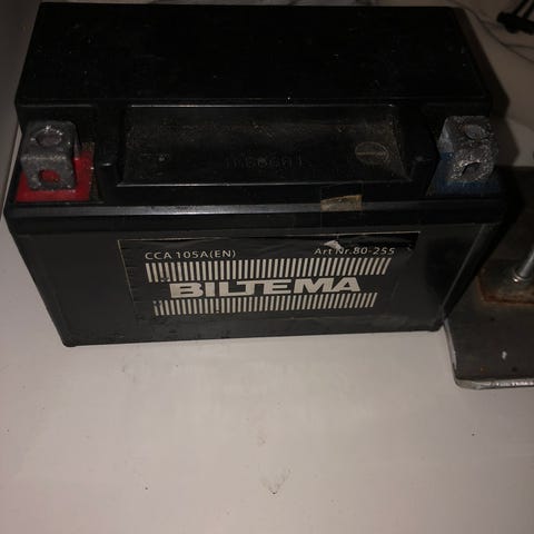 Uusi mopon akku, juuri hapotettu. Mopo lähti vanhalla akulla ja uusi jäi hyllyyn.