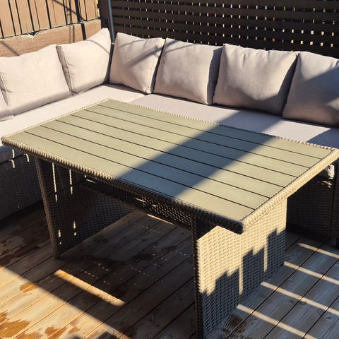Polyrottinkinen terassisohvaryhmä lasipöydällä