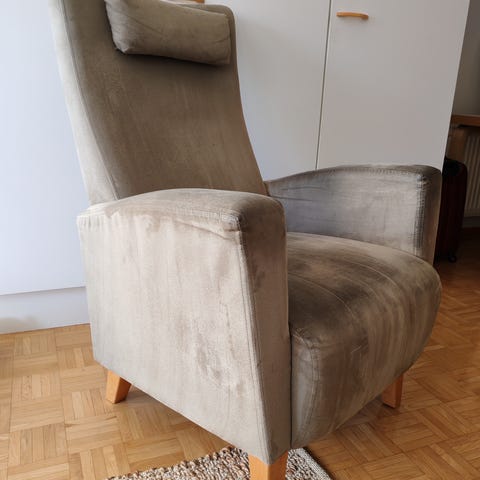 Annetaan beige nojatuoli rahilla, vaatii pesua. Huom eläintalous!