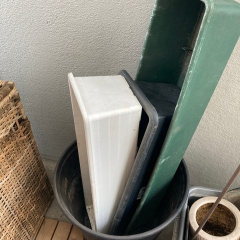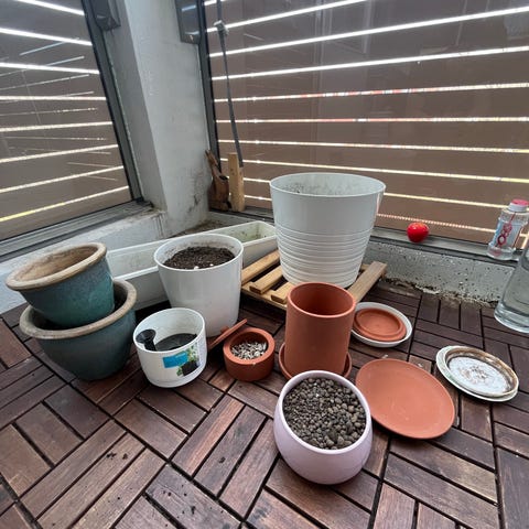 Erikokoisia istutusruukkuja ja -astioita ulko- tai sisäkäyttöön. Lisäksi muovinen kastelukannu ja kaksi nestemäistä kasviravinnepulloa. Sopii esimerkiksi parvekkeen, terassin tai pihan kasvien istuttamiseen ja hoitoon.