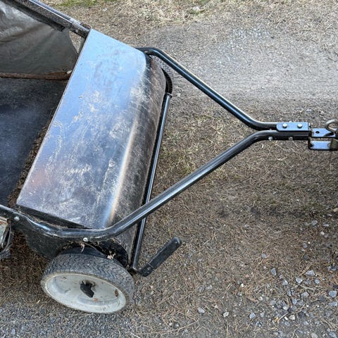 Ajoleikkuriin kiinnitettävä lehtikerääjä. Laitteessa on oranssi keruuyksikkö ja metallinen vetovarsi vetokoukkuun kiinnitystä varten. Takana on keruupussi johon lehdet ja roskat kerääntyvät.