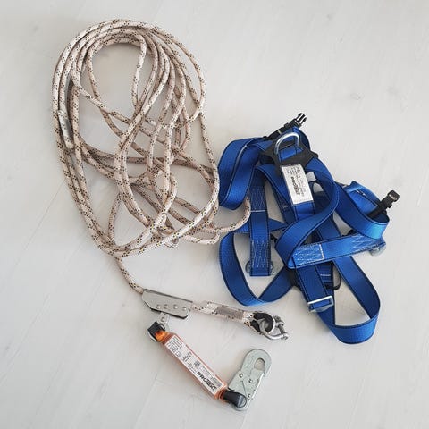 Turvavaljas, jossa siniset säädettävät hihnat ja kaksi karabiinihakaa. Valjaassa on punainen joustava liitososa, jonka päissä on lukittavat hakakiinnitykset. Sopii henkilön kiinnittämiseen esimerkiksi putoamissuojauksessa tai muussa turvakäytössä, jossa tarvitaan valjasmallinen kiinnitys. Hihnoja voidaan säätää käyttäjän koon mukaan.