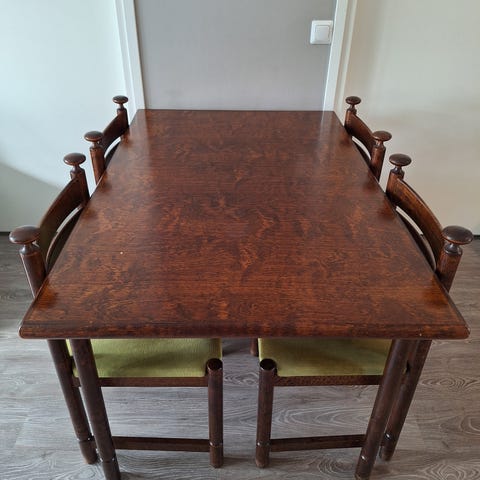 Iso 6 tuolin ja 250/330 kokoisen tammisen pöydän ryhmä. 70-luvun hyvää jämäkkää laatua askosta. Ei notku ei nitku. Löytyy myös sohvapöytä sarjaan. Käytetty mutta pieteetillä. Erinomainen isompiin pitoihinkin. Muuramessa.