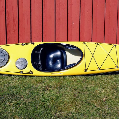 Kajaksport merikajakki keltainen. Kajakissa on suljettava lastiluukku, joustavat kansiköydet ja istuin selkänojalla. Sopii yksikkökajakiksi järvi- ja merimelontaan. Materiaali vaikuttaa olevan muovia. Väri on keltainen mustin yksityiskohdin.