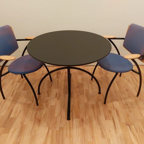 Pöydän halkaisija 120 cm. Hiekan väriset tuolit. Pyörivät. Kangas ehjä ja tahraton. Jalat Mustat.
