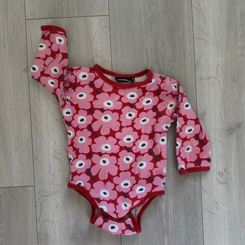 Marimekko vauvan body, koko 80. Pitkähihainen malli, punainen raidallinen kuosi. Materiaali puuvillaa. Suunniteltu tytöille. Nepparikiinnitys haarassa helpottaa pukemista ja vaipanvaihtoa.