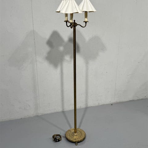 Klassinen lattiavalaisin, jossa on koristeellinen varjostin ja puinen jalka. Valaisimessa on kaksi lampunpidikettä, narukatkaisin ja koristeellinen jalusta.