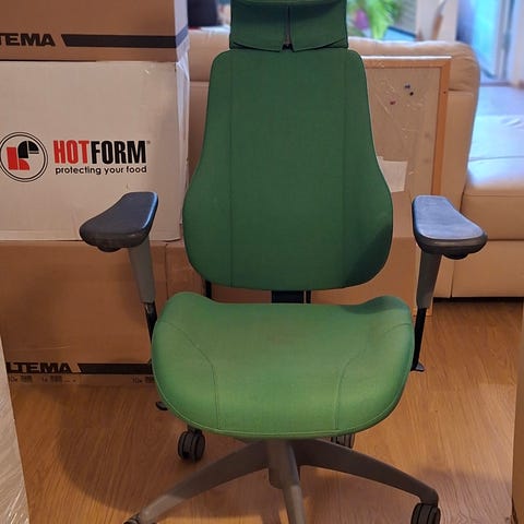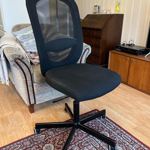 Musta toimistotuoli, jossa on käsinojat ja korkeussäädettävä istuin. Tuolissa on viisisakarainen jalusta pyörillä ja kangasverhoiltu istuin sekä selkänoja. Sopii työpöydän ääreen kotitoimistoon tai toimistokäyttöön.