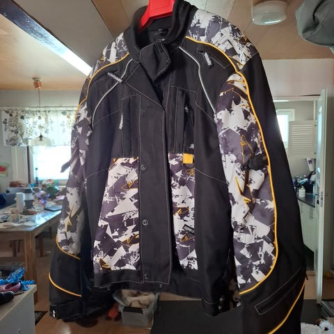 Kuoripuku, takki kevyesti topattu. Takki ja housut kokoa XL. Housuissa yksi paikka näkyy kuvassa.