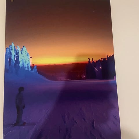 Hieno puukehyksissä oleva talvinen maisemataulu. Ollut viimeiset kuukaudet lämpimässä varastossani, koska nykyisen asuntoni seinälle ei tauluja saa ripustella.