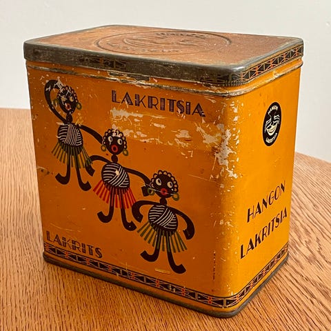 Halva lakritsia metallipurkki. Keltainen pyöreä peltipurkki, jossa painatukset suomeksi ja englanniksi. Sopii esimerkiksi säilytys- tai koristekäyttöön keittiössä tai muussa tilassa.
