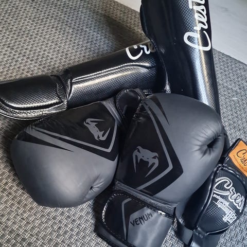 Thaiboxing, tai miksei kuntonyrkkeilyynkin, aloitusasusteet: TWINSin thaiboxing nyrkkeilyhanskat, säärisuojat kovat, nilkkasuojat tekstiili, rannesuojat sekä thaiboxing shortsit.