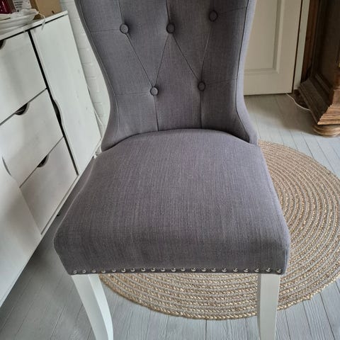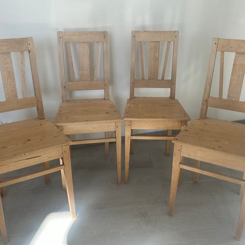 Tuolissa on kiinteä puinen istuin ja kaarevat etu- ja takajalat. Selkänojassa on koristeellinen yläosa. Sopii esimerkiksi ruokapöydän tuoliksi tai lisäistuimeksi eri tiloihin. 5 kpl.