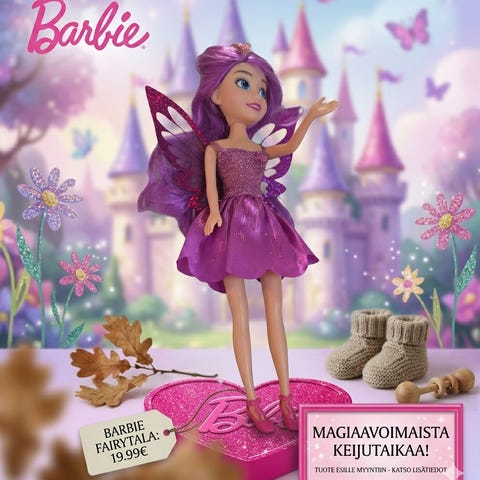 Barbie nukke perhosensiivillä. Nukella on suuret, moniväriset perhosensiivet, joissa on vaaleanpunaista, oranssia ja mustia yksityiskohtia. Päällä on vaaleanpunainen mekko ja nukella on vaaleat hiukset ponihännällä. Selässä on mekanismi, jolla siivet avautuvat ja sulkeutuvat. Nilkassa on vihreä ranneke ja vaaleanpunainen perhoskoriste. Soveltuu leikkeihin, joissa teema on esimerkiksi keiju- tai perhosmaailma.