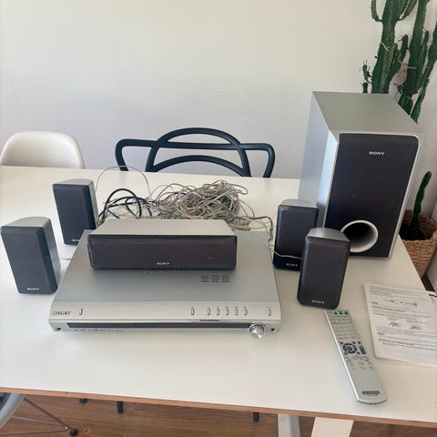Toimiva laite sinänsä, mutta kaiuttimien lähtöliitännät (katso kuva) ovat jotakin Sonyn omia, joihin en ole löytänyt sopivia johtoliittimiä enkä osaa itse tehdä. Kätevä kaveri varmaan keksii sopivat liittimet. Mukaan tulee laitteiston oma subbari, ferriitit kaiutinjohtoihin sekä kaukosäädin. Vain nouto.