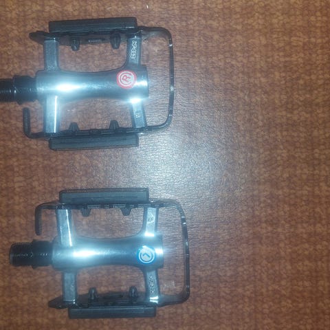 Pari testilenkkiä paikoillaan käyneet polkimet, likimain uudenveroiset - lähinnä pari pientä naarmua siitä kun nämä irrallaan kotiin kuljetin.