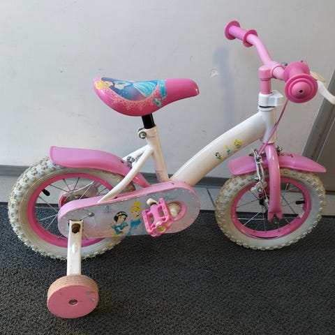Nishiki lastenpyörä 12" renkailla. Pyörässä on punainen runko, musta etuosa ja satula, jossa violetti takaosa. Varustettu apupyörillä, jotka tukevat ajamisen opettelua. Sopii pienelle lapselle ensimmäiseksi polkupyöräksi, kunhan rungon koko ja ajoasento tarkistetaan käyttäjälle sopiviksi.