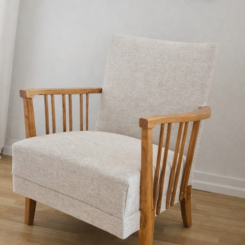 Kaunis vanha nojatuoli, joka on juuri verhoiltu vaalean harmaalla kestävällä ja helppohoitoisella kankaalla.