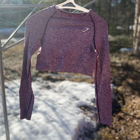 Gymshark pitkähihainen treenicroppipaita ja legginsit naisille. Koko S. Harmaa-sininen joustava ja vartaloa myötäilevä materiaali, jossa hengittäviä neuloskohtia. Paidassa on pidennetyt hihat ja peukaloaukot, jotka auttavat hihoja pysymään paikallaan salitreenin aikana. Sopii erityisesti salitreeniin ja muuhun sisäliikuntaan.