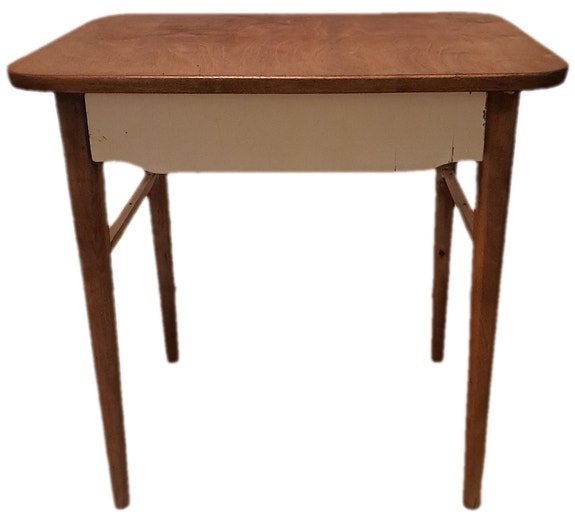 Kaunis 50-luvun kirjoituspöytä. Uusi lakkapinta kannessa. Muutamia elämän jälkiä toki löytyy. Avainta ei ole.