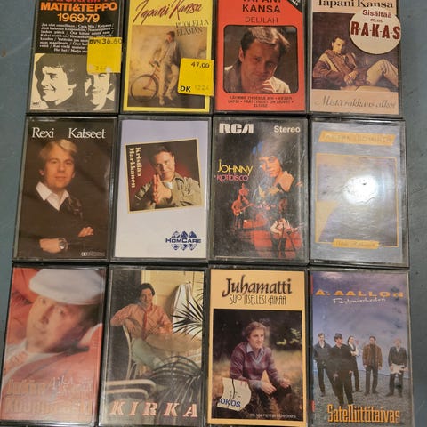 Kokoelmassa on useita musiikkikasetteja eri esittäjiltä ja levy-yhtiöiltä. Kasetit ovat alkuperäisissä muovikoteloissaan, joissa on kannet ja takakannet painettuine kappalelistoineen. Sopii kokoelmaa täydentävälle tai kasettisoittimella kuuntelevalle musiikin harrastajalle. Myydään yhtenä eränä.