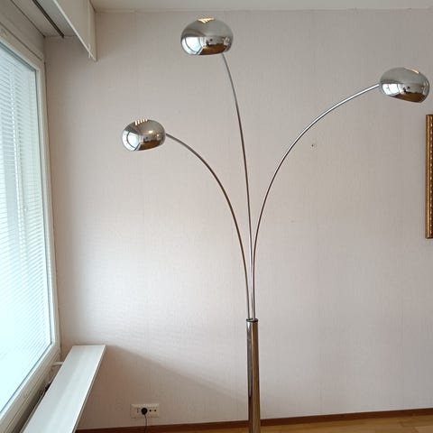 Toimiva krominvärinen "viisijalkanen" lamppu. Korkein kohta n. 225cm