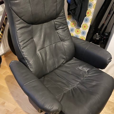 Annetaan ikean keinonahkainen pieni musta nojatuoli. Muuten hyvässä kunnossa mutta pieni repeämä takana, mistä erikseen kuva.