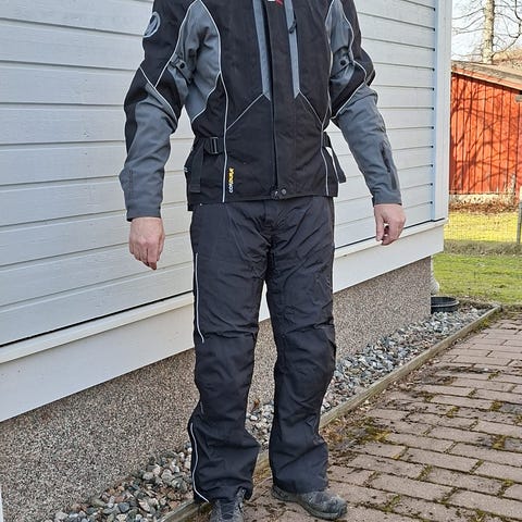 Erittäin hyvä, vasta pesty ajotakki. Irroitettava sisävuori, suojat olka- ja kyynärpäissä. Kuvassa 180/90 koon henkilön päällä. Povitasku, kaksi taskua edessä ja yksi vasemmassa hihassa. Vetoketjukiinnitys housuja varten. Vahvaa UD hiilikuitukangasta. BMW merkin saa pois jos haluaa. Haku Kokkolasta tai pk 8,90. Eläintalous.