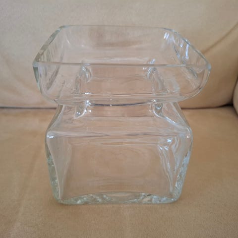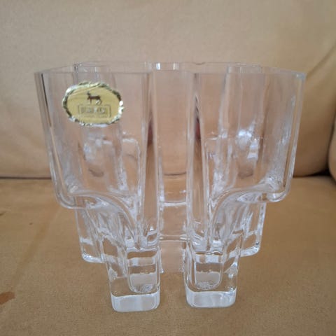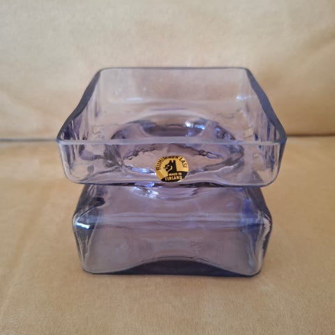 Hyrrä-maljakko, Riihimäen Lasi, suunnittelija Helena Tynell, savunharmaa, korkeus 13 cm, leveys leveimmältä kohdalta noin 18 cm, yläosasta 16 cm, virheetön.