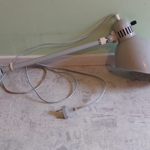 Myydään vanha saksalainen teollisuusvalaisin arviolta 1940-60 luvulta, jossa on selkeä Bauhaus‑henkinen muotoilu ja aikakaudelle tyypillinen mekaaninen rakenne.