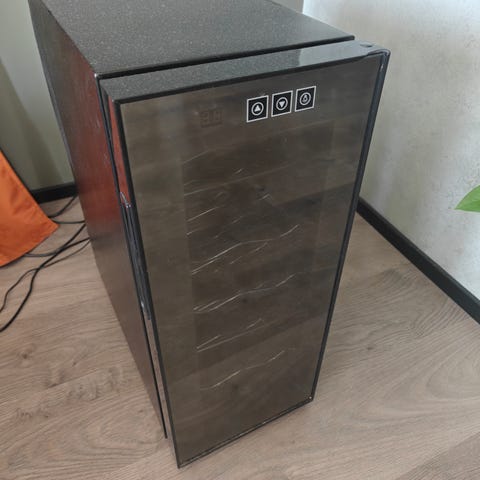 Vapaasti sijoitettava viinikaappi, jossa on lasiovi ja musta runko. Kaapissa on useita metallisia pullotelineitä viinipullojen säilytykseen vaakatasossa. Yläosassa on digitaalinen lämpötilanäyttö ja kosketuspainikkeet lämpötilan säätöön. Sisävalaistus helpottaa pullojen näkemistä. Soveltuu viinien ja muiden juomien viileäsäilytykseen keittiössä tai oleskelutilassa.