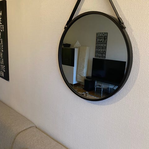 Pyöreä seinäpeili mustilla reunoilla. Halkaisija 75cm.