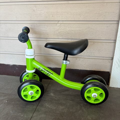 Paljon käytetty pyörä, pääsee potkuttelemaan eteenpäin, mutta jotakin kolinaa kuuluu, ja käsijarru ei kovin napakasti jarruta.