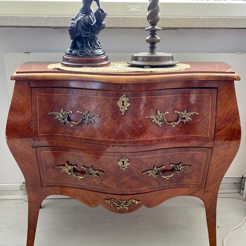 Kaunis puinen rokokoo-tyylinen sohvapöytä, jossa soikea, kaarevareunainen pöytälevy ja koristeellinen jalka. Pöytä on ruskeaa puuta, kiiltolakattu, pinnassa näkyy puunsyyt ja viilukuvio. Sopii olohuoneeseen sohvapöydäksi tai sivupöydäksi.
