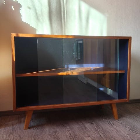 Vanha kulmavitriini. Ylhäällä lasiovet. Sekä ylä- että alaoven lukko toimii. 1 kpl avain. Kolhuja on, näkyy kuvissa. Tämä huomioitu hinnassa. Korkeus 151 cm, levein kohta 88 cm, syvin kohta 47,5