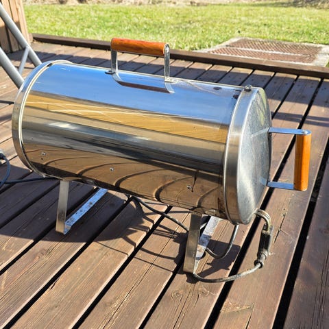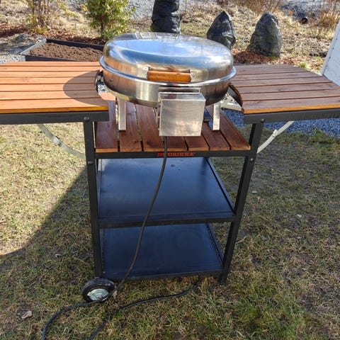 Muuriikka sähkösavustin, ruostumattomasta teräksestä. Sylinterimallinen runko, kantokahva päällä ja jalustat, joiden varassa grilli seisoo tasolla. Sähkökäyttöinen malli.